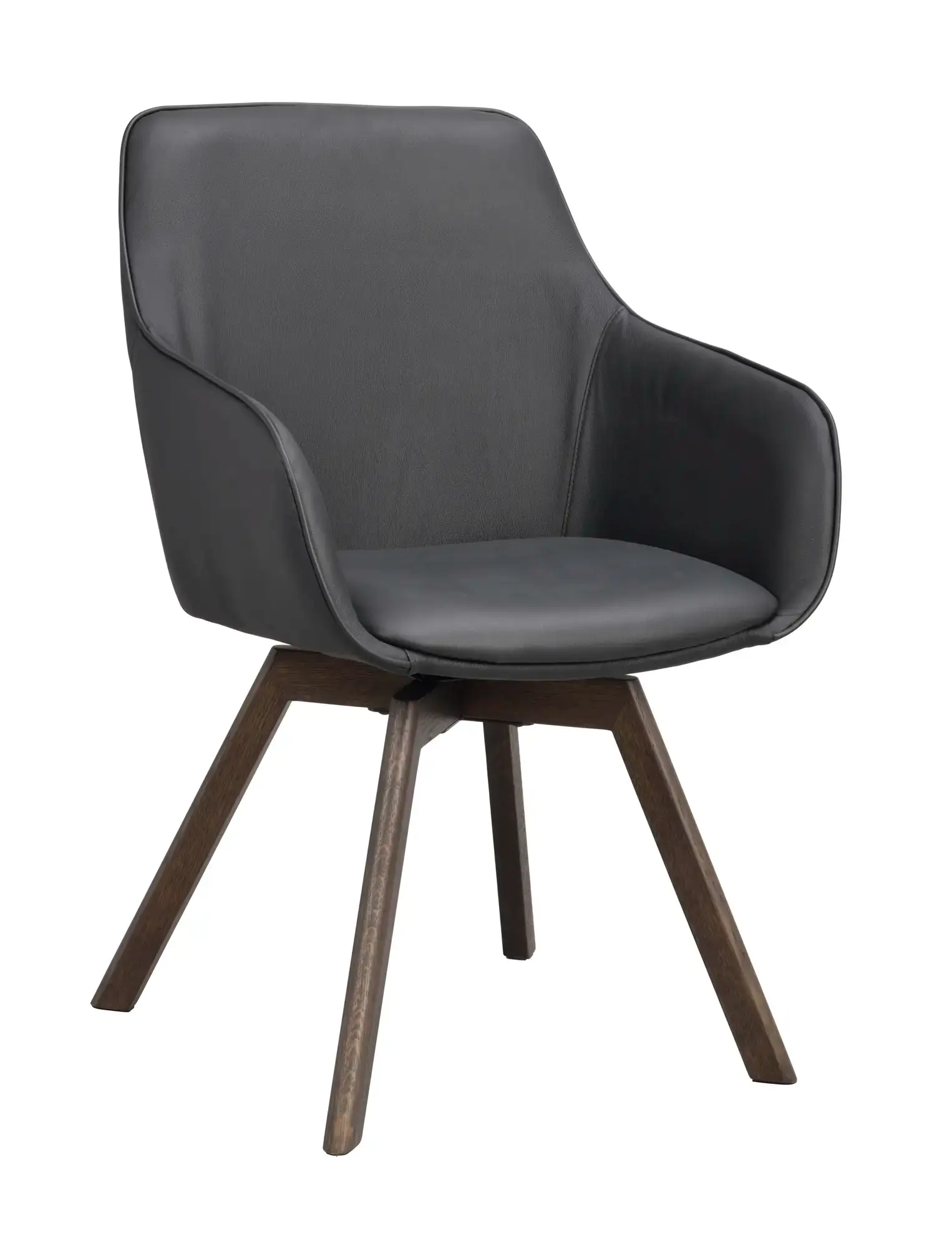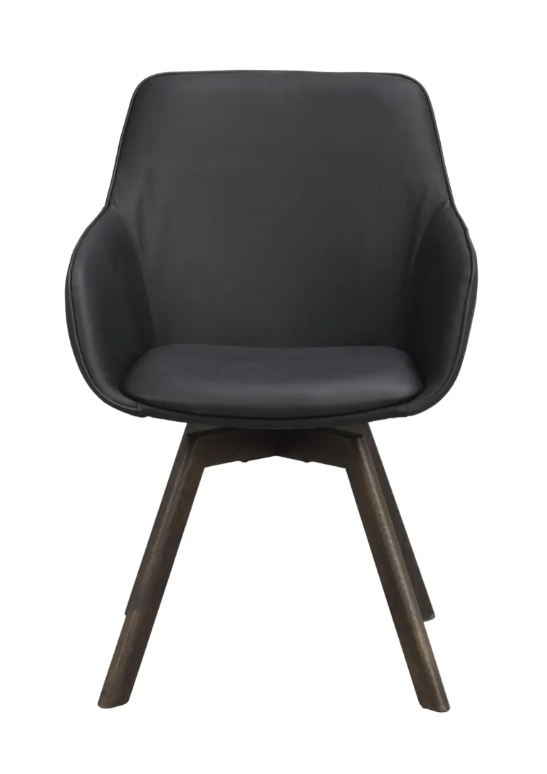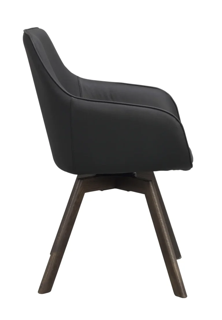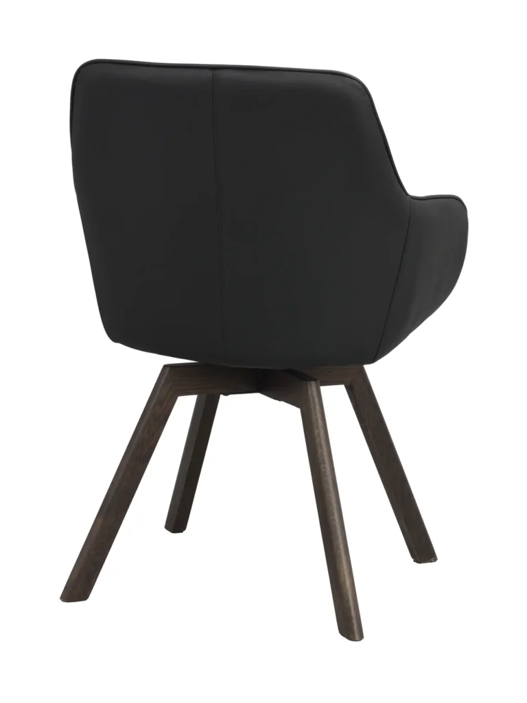 Alison karmstol i svart läder har precis som populära Alison stol ett snurrbart underrede i 360 grader. Den kupade stoppade sitsen och de höga armstöden gör stolen bekväm och ombonad att sitta i. Alison karmstol med träunderrede gör det lätt att matcha karmstolen med andra trämöbler i hemmet.