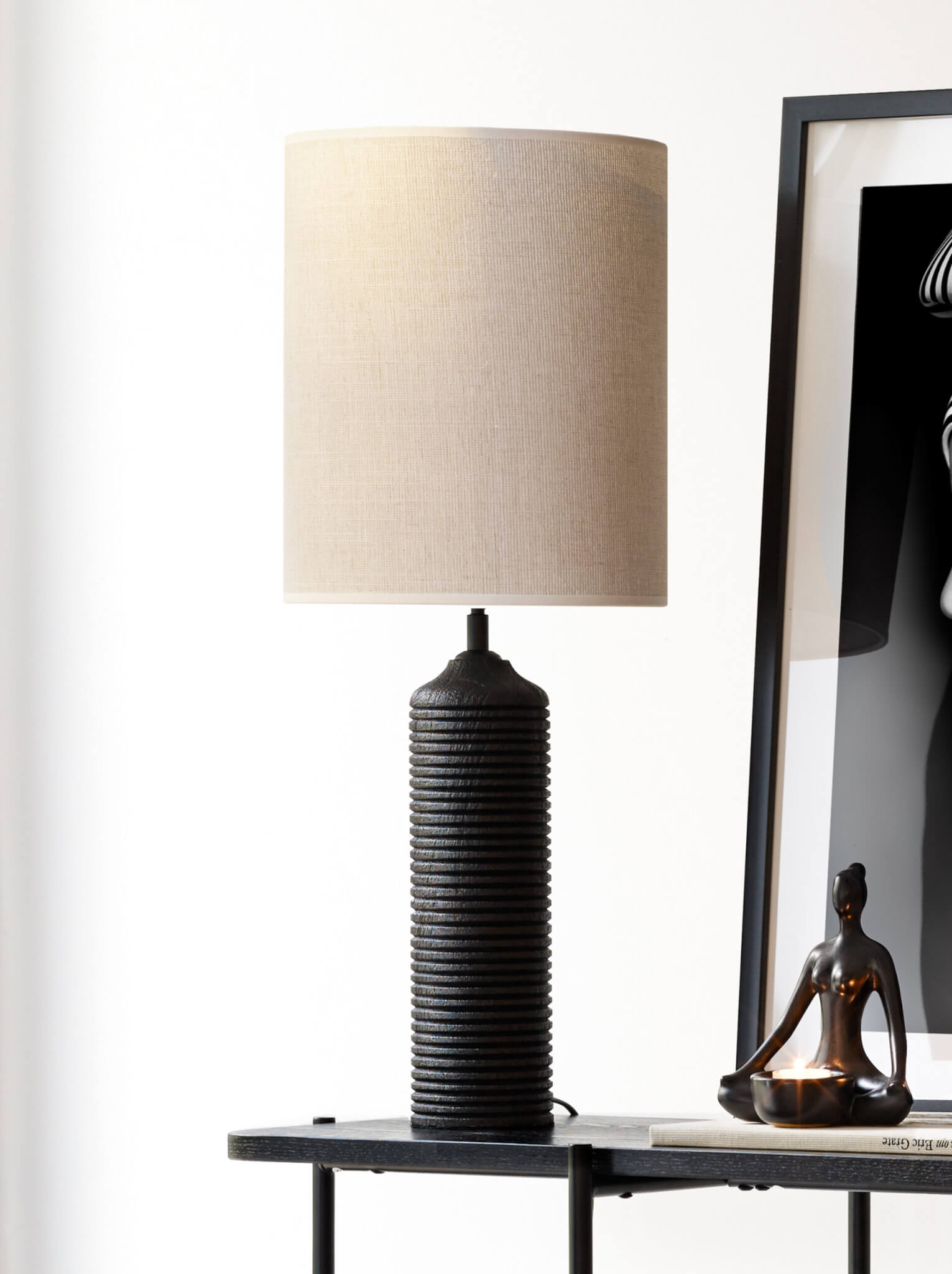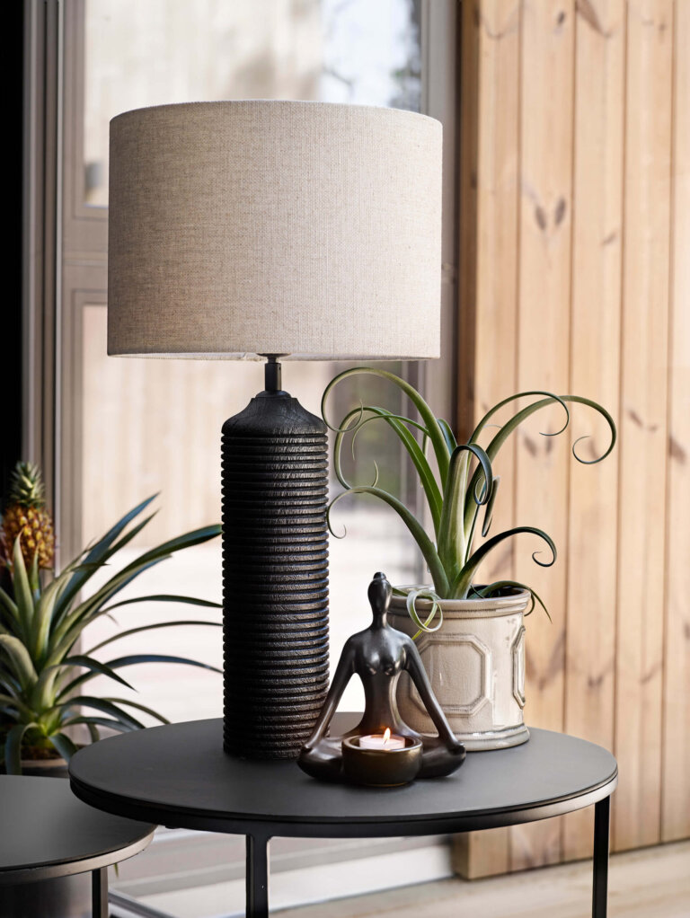 Lampfot i svartmålat mangoträ. Randig yta.
