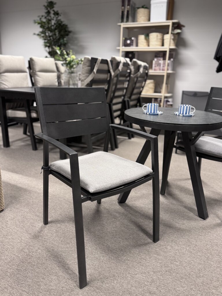 Como matbord 70cm tillsammans med 2st stolar i aluminium och ljusgrå dyna.