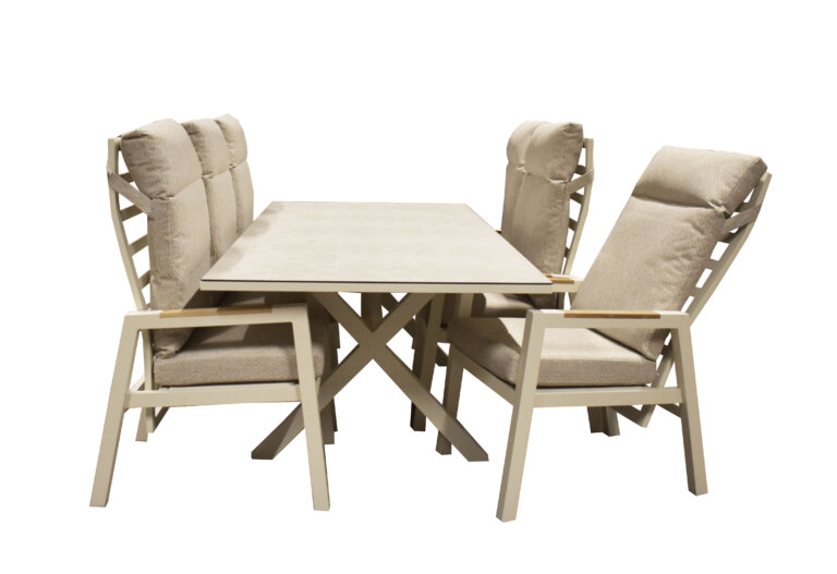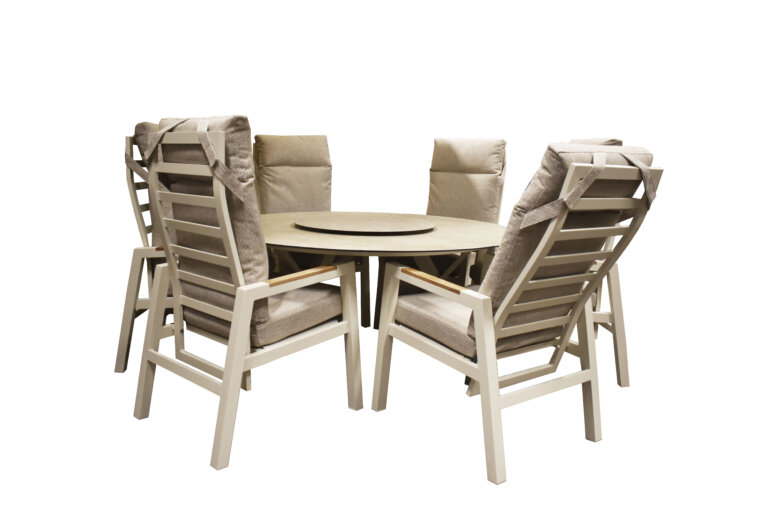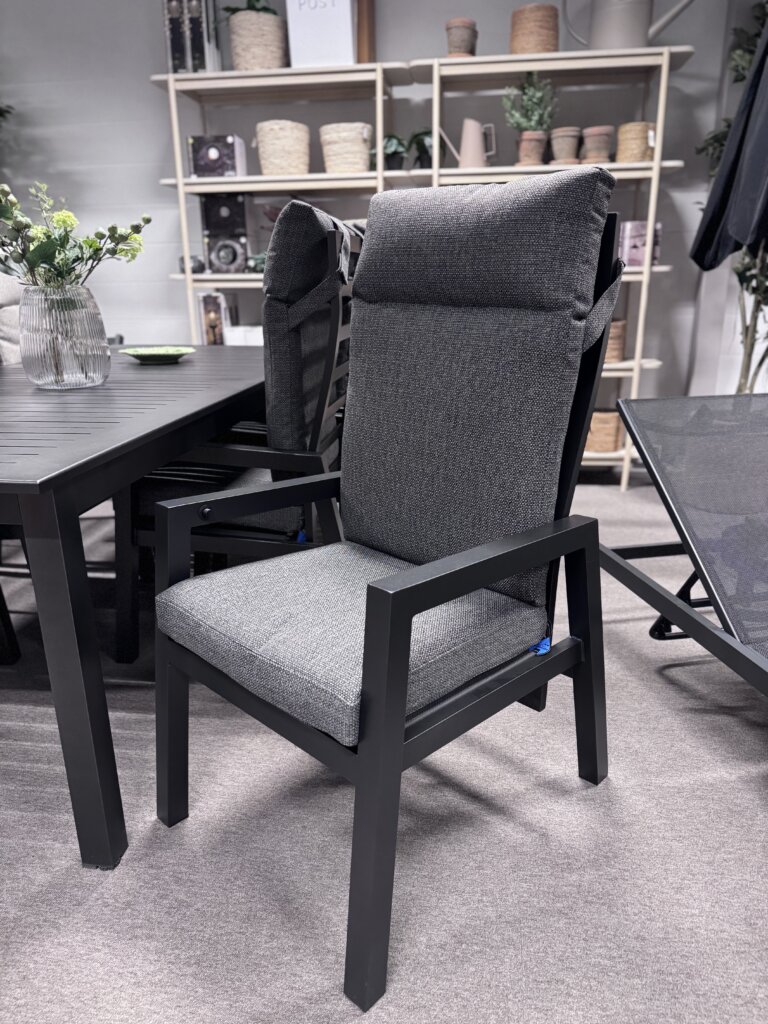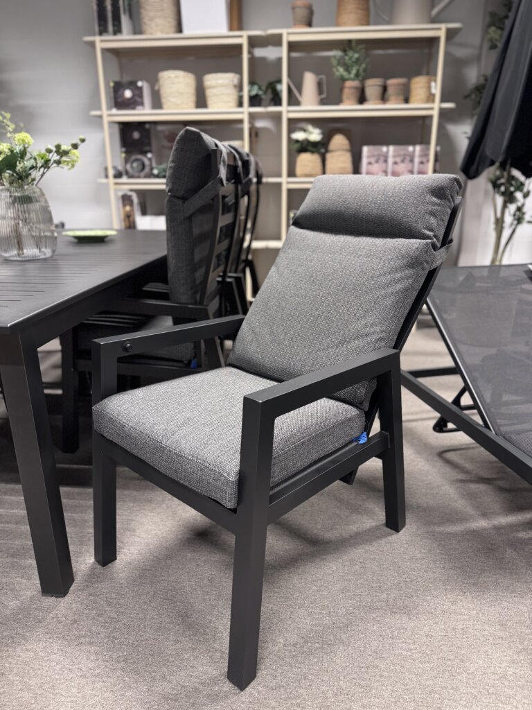 Como karmstol med hög justerbar rygg och extra tjock dyna. Finns i färgen antracit med beige dyna, antracit med antracit dyna, eller cremefärgad med beige dyna och teakdetaljer.