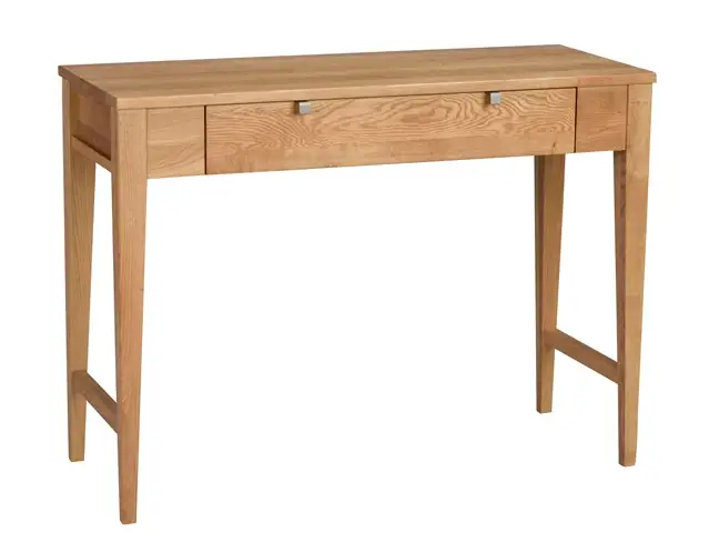 Confetti avlastningsbord i massiv oljad ek. Två lådor fram med knoppar i metall. Enkelt att inreda ditt hem med och fungerar lika bra som skrivbord. Avlastningsbordet ingår i hallserien Confetti.