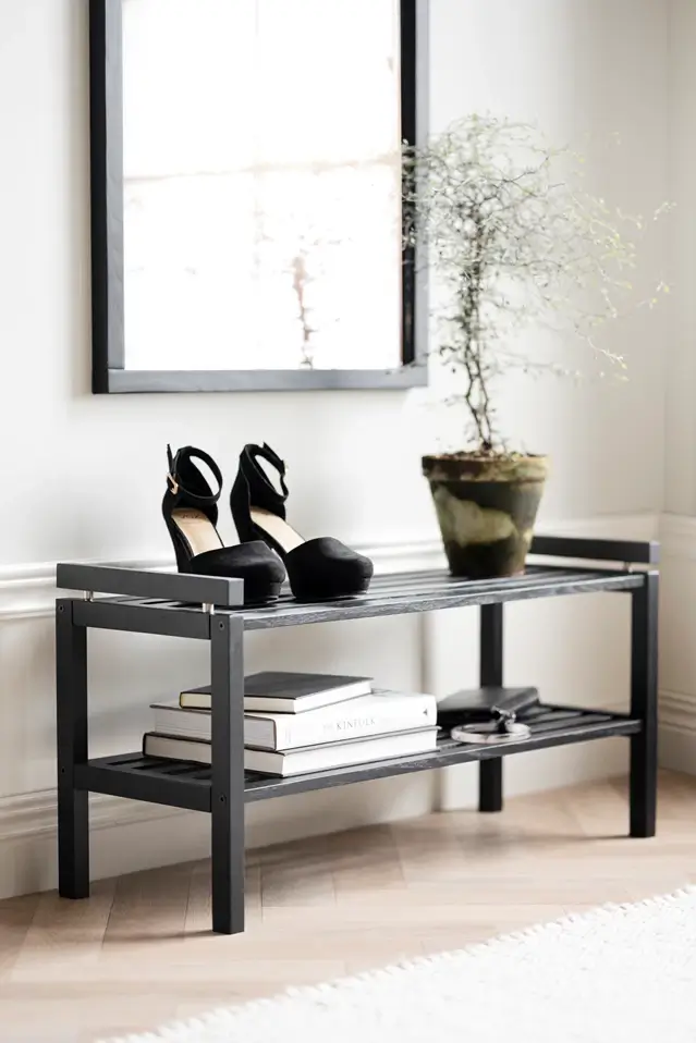 Confetti skohylla i massiv och svartlackad ek. Stilren och enkel att placera. Skostället ingår i hallserien Confetti.