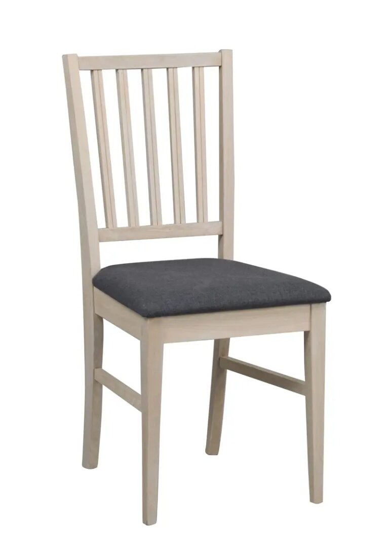 Trästol i tidlös och skandinavisk design. Stolen är i oljad ek med dekorativ stoppad sits med grått tyg. Levereras monterad. Stolen ingår i vår serie Filippa.