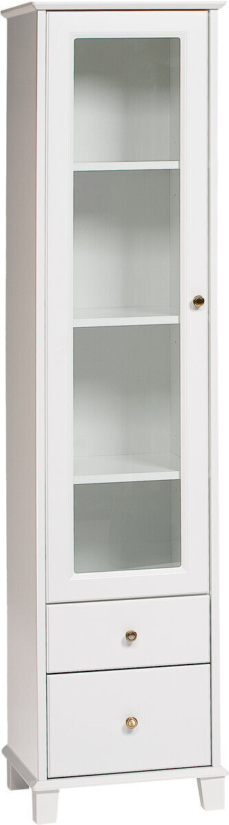 Klassiskt vitrinskåp i lackad vitpigmenterad ek med glasdörrar samt en låda. Mjukstängande låda och dörrar samt hyllplan i härdat glas. Vitrinskåpet ingår i serien Filippa som även innehåller matchande matbord och soffbord.
