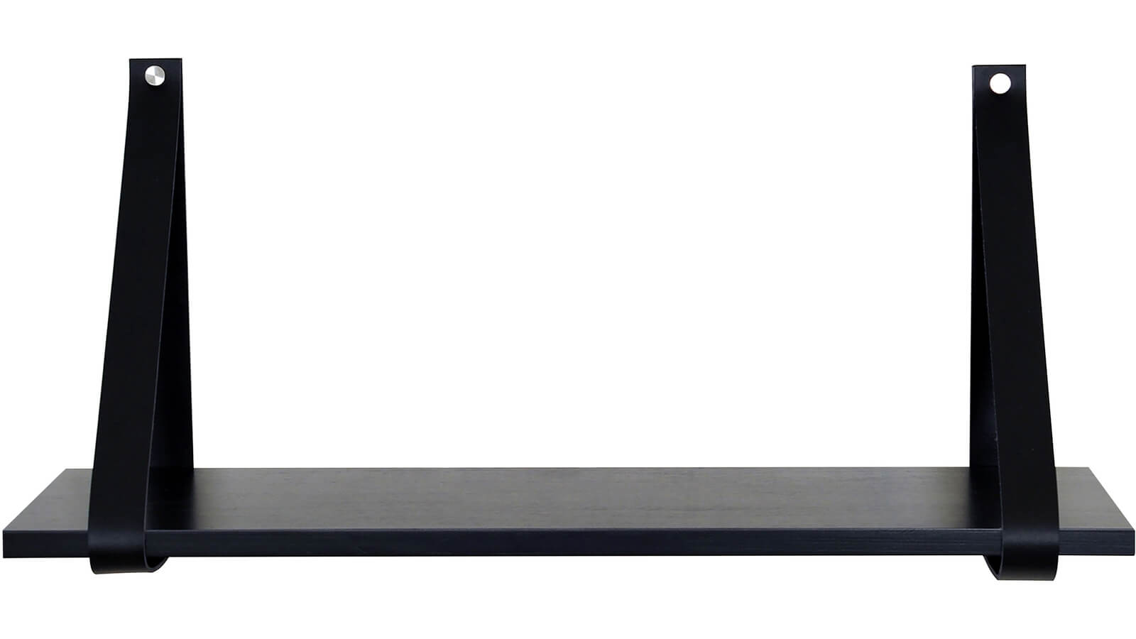Frikk vägghylla i svartlackad furu med läderhängen.