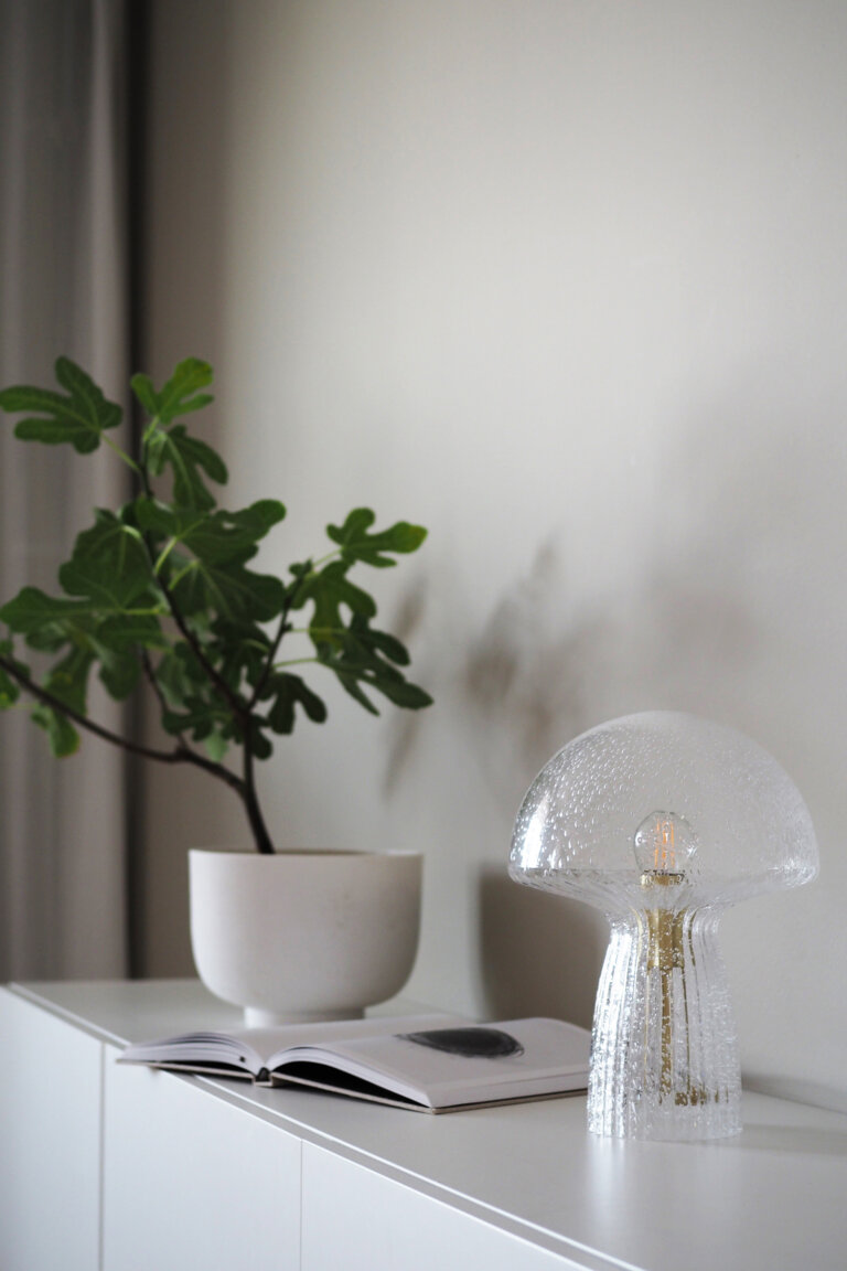 Med inspiration från skogen kommer denna nätta bordslampa avbildad som en svamp. Den är gjord av klarglas med räfflade detaljer på foten där räfflorna går hela vägen upp under hatten likt lamellerna på en skivlingsvamp. Lampan har dessutom små vackra luftbubblor i glaset som ger en fin karaktär när lampan är tänd. Fungo har en lamphållare i kontrasterande borstad mässingsfärgad metall.