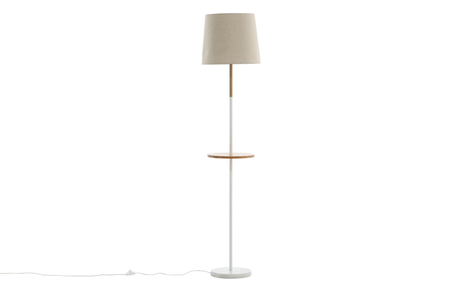 Hattman är en klassisk golvlampa med avlastningsyta! Perfekt vid läshörnan där du kan lägga din bok eller vid soffan där du kan ställa din kaffekopp. Lampan är vit med trädetaljer, linneskärm och har en fot i vit marmor.