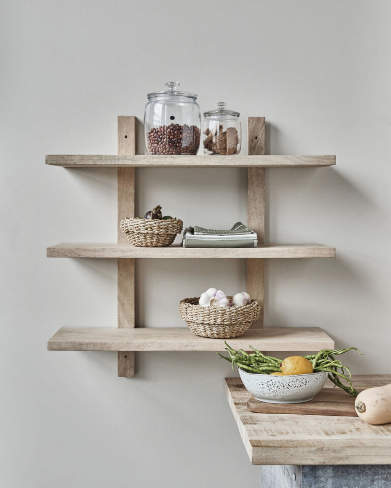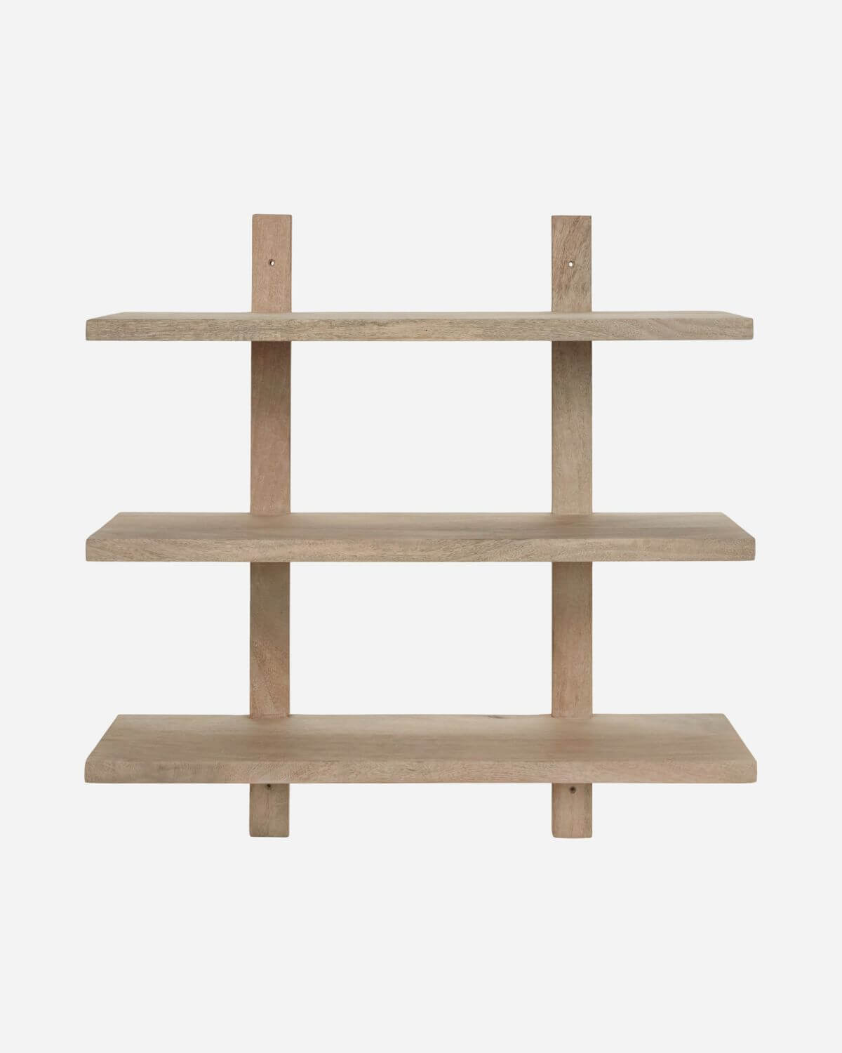 En tidlös vägghylla med tre hyllplan, gjord i mangoträ. Finns även i svart!