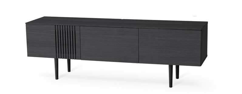 Joel mediabänk i fanerad svartbetsad ek med tre dörrar och ett trähyllplan bak varje. Svarvade ben medföljer men bänken kan som alternativ monteras på vägg.