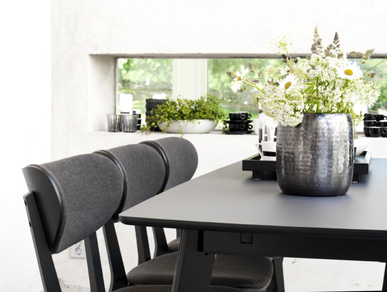 Stolen Kato i svartlackad ek har en stoppad sits med mörkgrått polyester tyg. Stolen är riktigt stabil stol och passar lika bra till matbordet som för sig själv. Stommen är massiv och sits samt rygg består av böjd plywood. Stolen ingår i vår serie Kato och finns i fler färger.