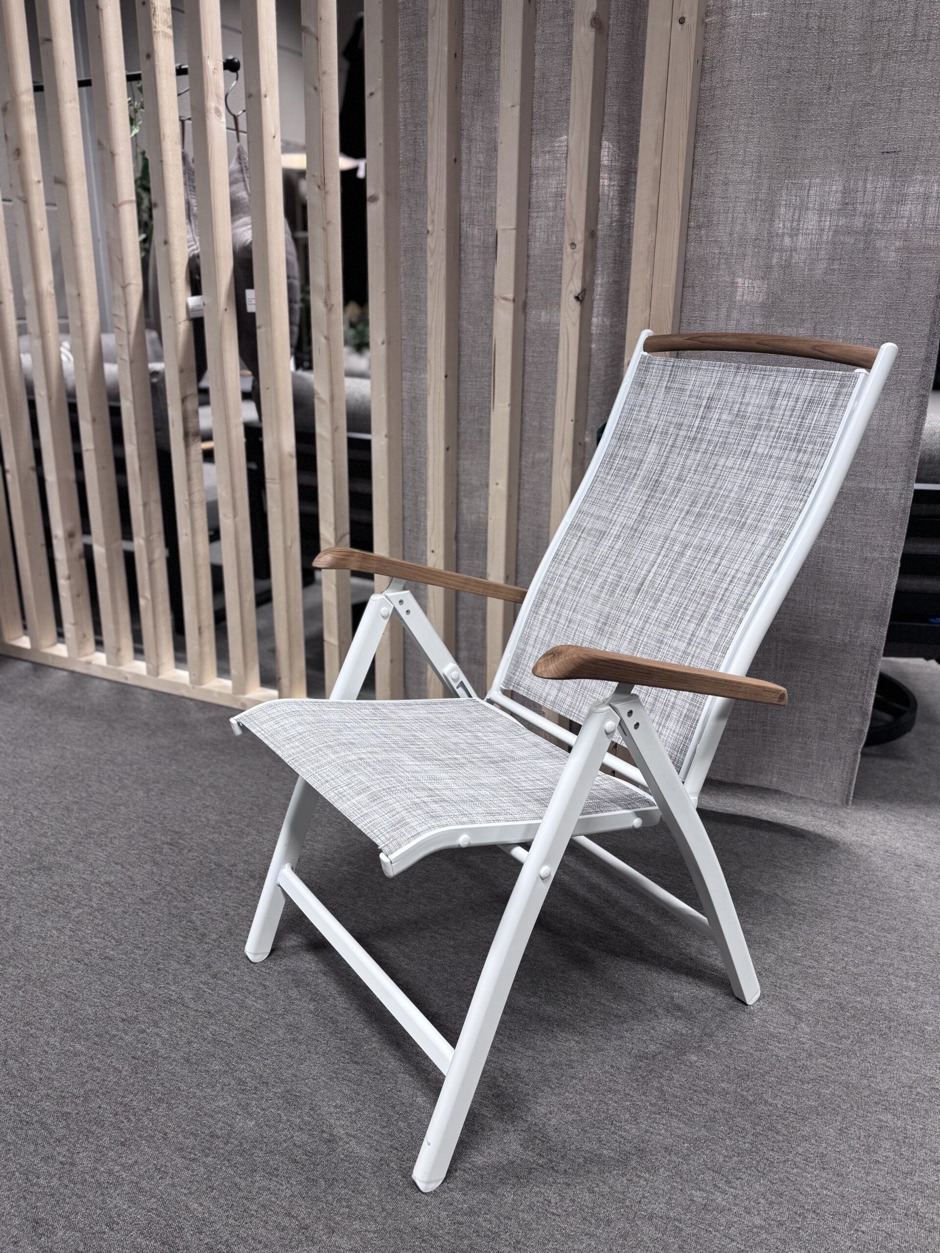 Kiwi positionsstol i vit aluminium med teakdetaljer och sits i slitstark textilene.