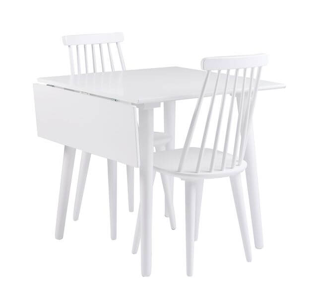 Lotta matbord 80cm med klaff tillsammans med Lotta stol i vitlack. Matbord i stilren skandinavisk design. Fäll ut bordskivan vid behov och få ett större bord med plats för fler. Stol i klassisk design. Pinnstolen är i vitlackat gummiträ.
