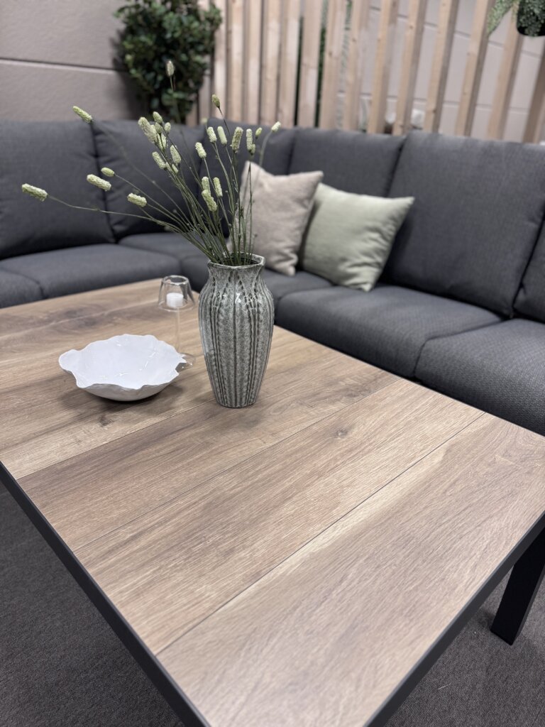 Lugano vändbar hörnsoffa 3H2/2H3 i antracit med mörkgrå dynor och soffbord Orlando 140cm.