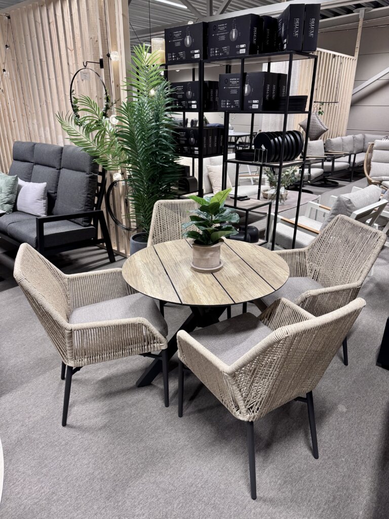 Milano matbord ø90cm tillsammans med 4st Vista stolar inkl. dynor. En perfekt matgrupp för den mindre uteplatsen!