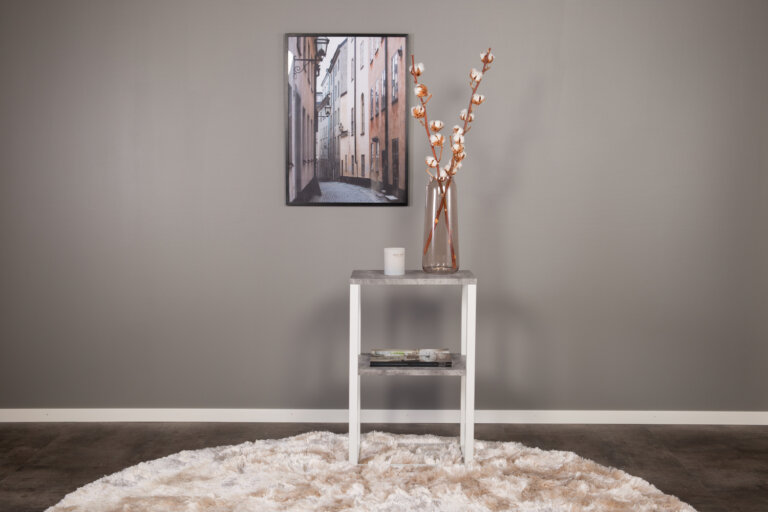 Sängbord Rise har två smarta hyllplan i MDF med läcker betong-imitation.
