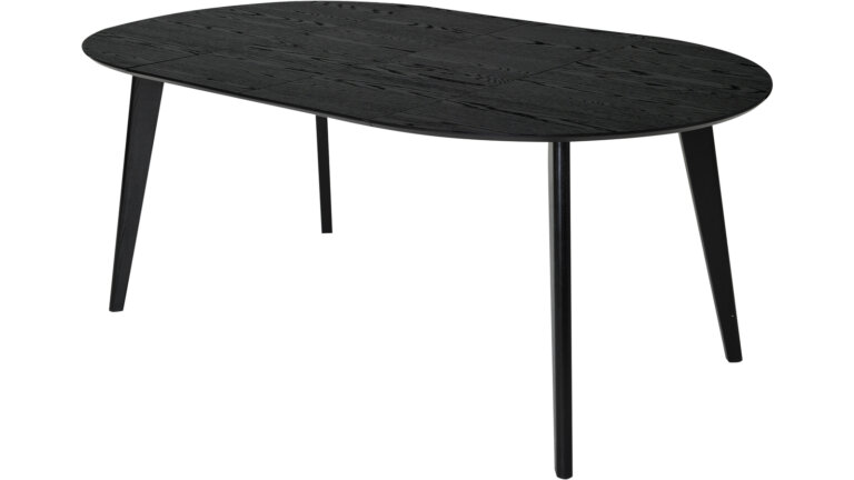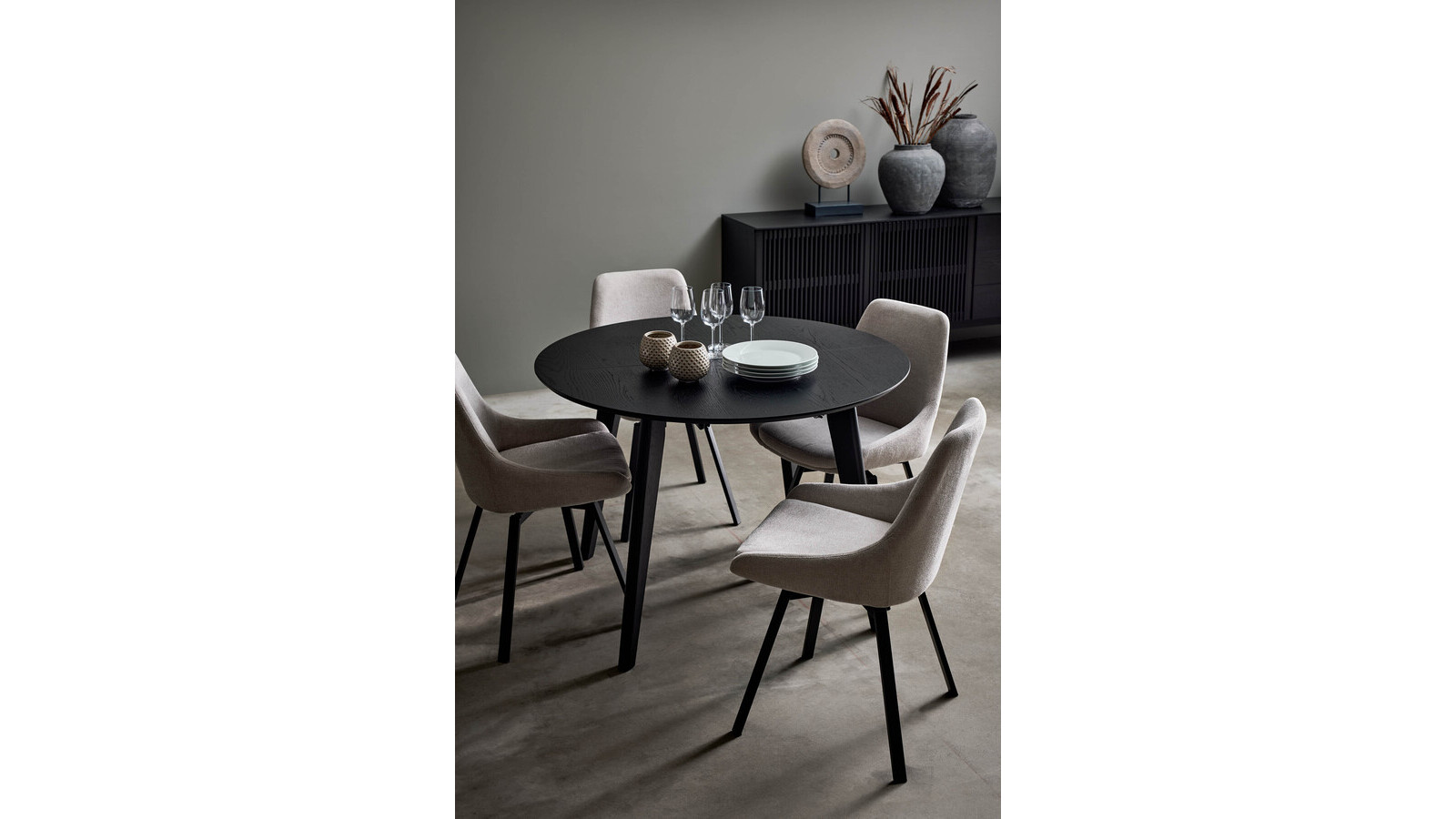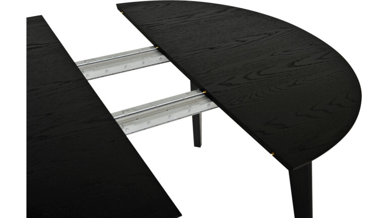 Sagene matbord Ø110cm i en svartlackad ekfaner. Inkl. 2st iläggsskivor á 40cm.
