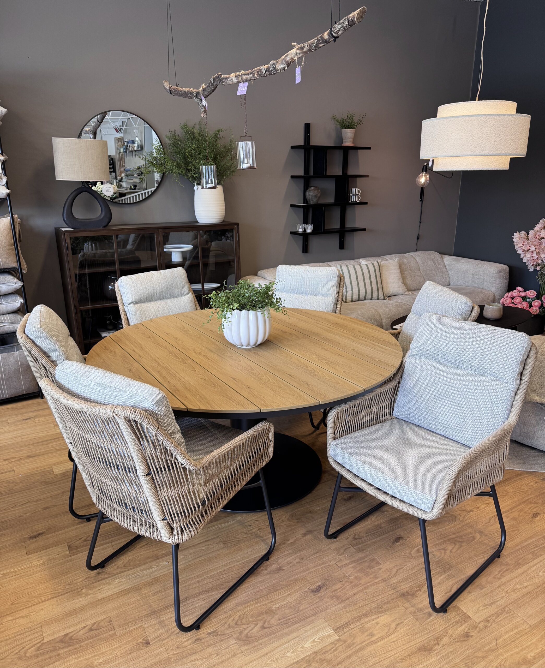 Matbord Viola Ø157cm tillsammans med 6st Viola matstol inkl dynor. Det runda matbordet med toppskiva i polywood ger ett fint intryck av teaklook, men helt underhållsfritt!