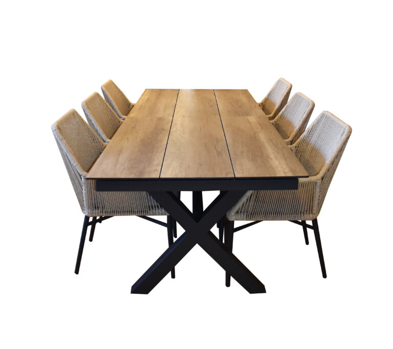 X-leg matbord 240cm med inbyggd iläggsskiva på 75cm. Bordets maxlängd blir 315cm. 6st Vista stolar  i färgen beige/antracit, inkl. dynor.