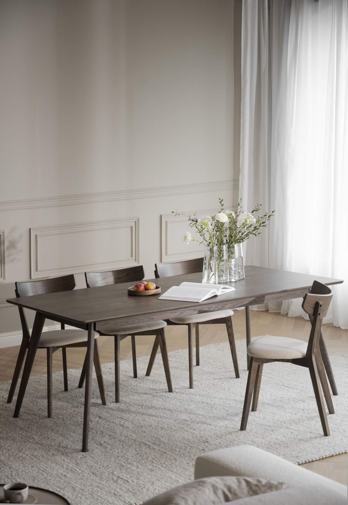 Yumi rektangulärt matbord med lätt utställda ben ben tillsammans med Ami stol i massiv brunlackad ek. Matbord i brunlackad ekfanér med ben av massiv ek och kan kompletteras med upp till två iläggsskivor som ger en maxlängd på hela 280cm. Både bord och stolar finns i flera fina färger.
